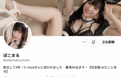 大家注意到这个帐号(https://twitter.com/pokomaru_cmore)了吗?其实因为一开始的作业失误,她真正的艺名提前曝光了,不过我没那么不上道,等片商和事务所公布后再跟进。现在的她叫ぽこまる,自我介绍栏写的是「家出してX年。C-moreさんに拾われました、夏顷AV出ます。」,意思是她离家出走好多年,被C- More、也就是AV界的事务所捡了回来,然后她会在夏天的发行AV作品〜