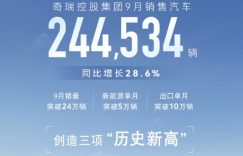 奇瑞控股集团9月销售汽车244534辆 创三项“历史新高”